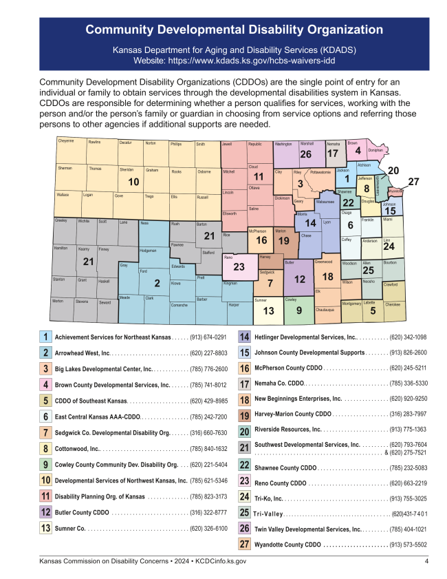Past legislative reforms to the Kansas developmental disability service system, established a network of Community Developmental Disabilities Organizations that contract with the Kansas Department of Aging and Disability Services. A CDDO has been designated for every area of the state to help coordinate services and supports for individuals with intellectual and developmental disabilities.